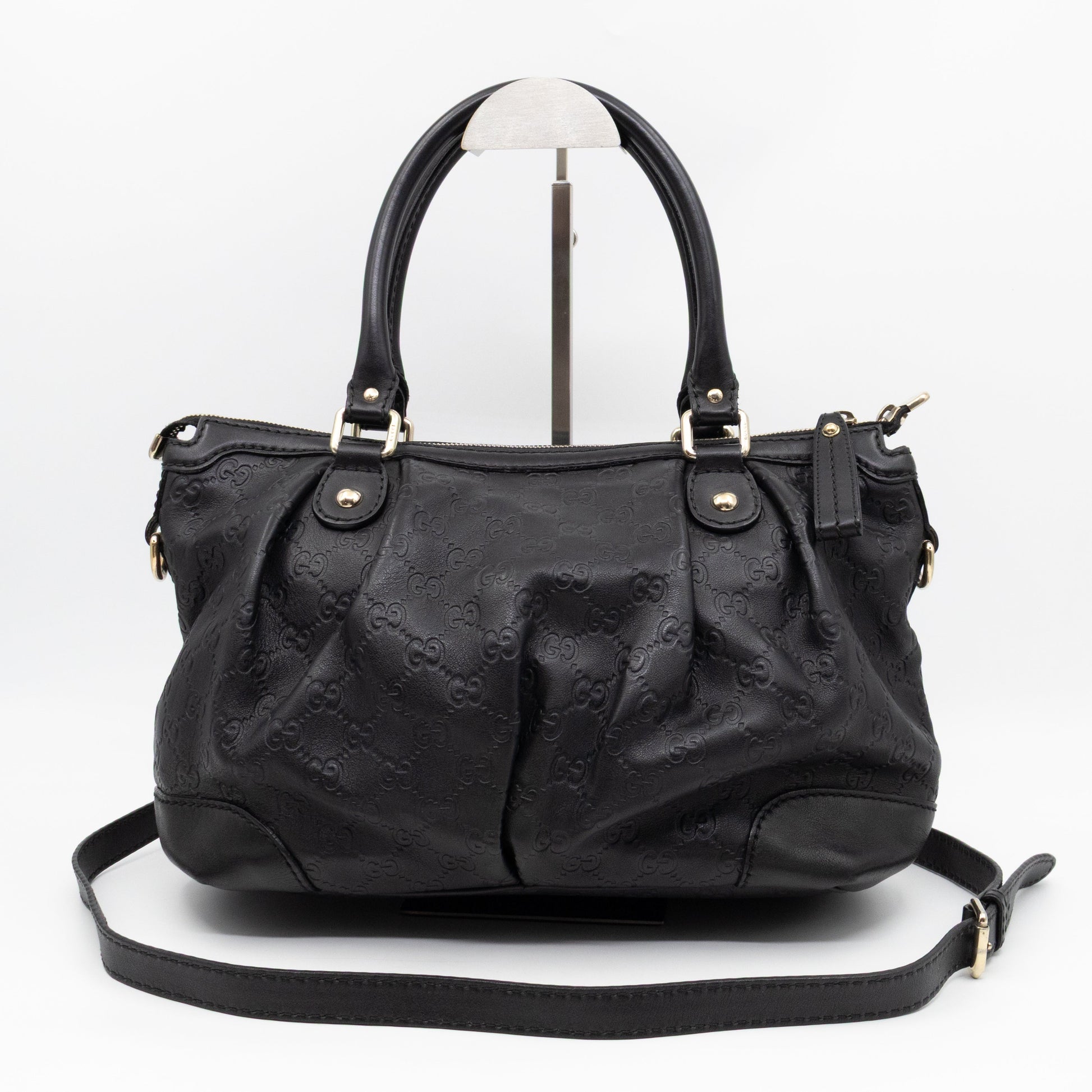 This is a Gucci Sukey Medium Top Handle Tote Bag. Made with Guccissima leather in balck with silver-tone hardware. The bag features leather rolled handles and an removable shoulder strap. The top zipper opens to a fabric interior with zipper and patch pockets.