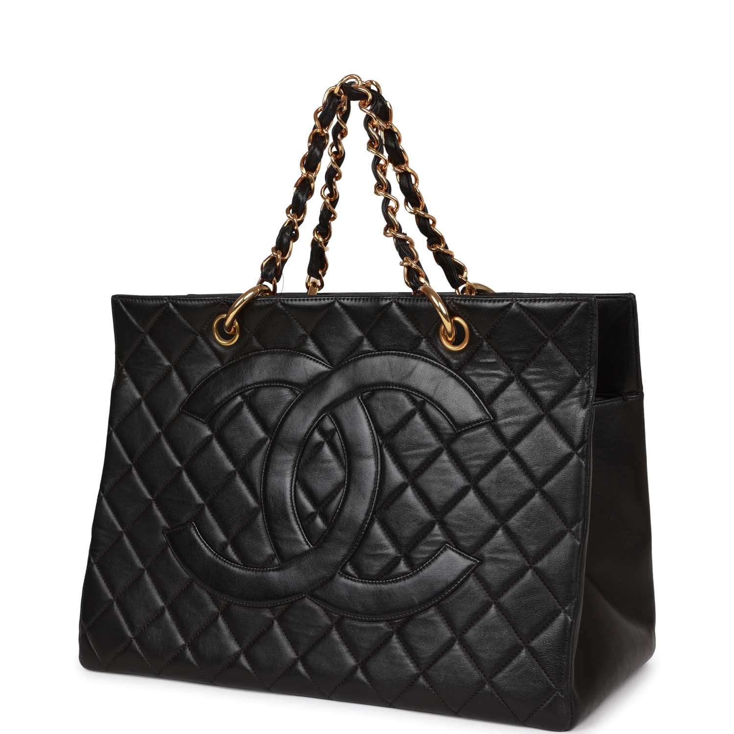 This Vintage Grand CC Timeless Tote Bag is in Black quilted lambskin with gold hardware and features a signature CC embossed logo on the front, an open top, and two interwoven gold plated chain link and black leather shoulder straps.