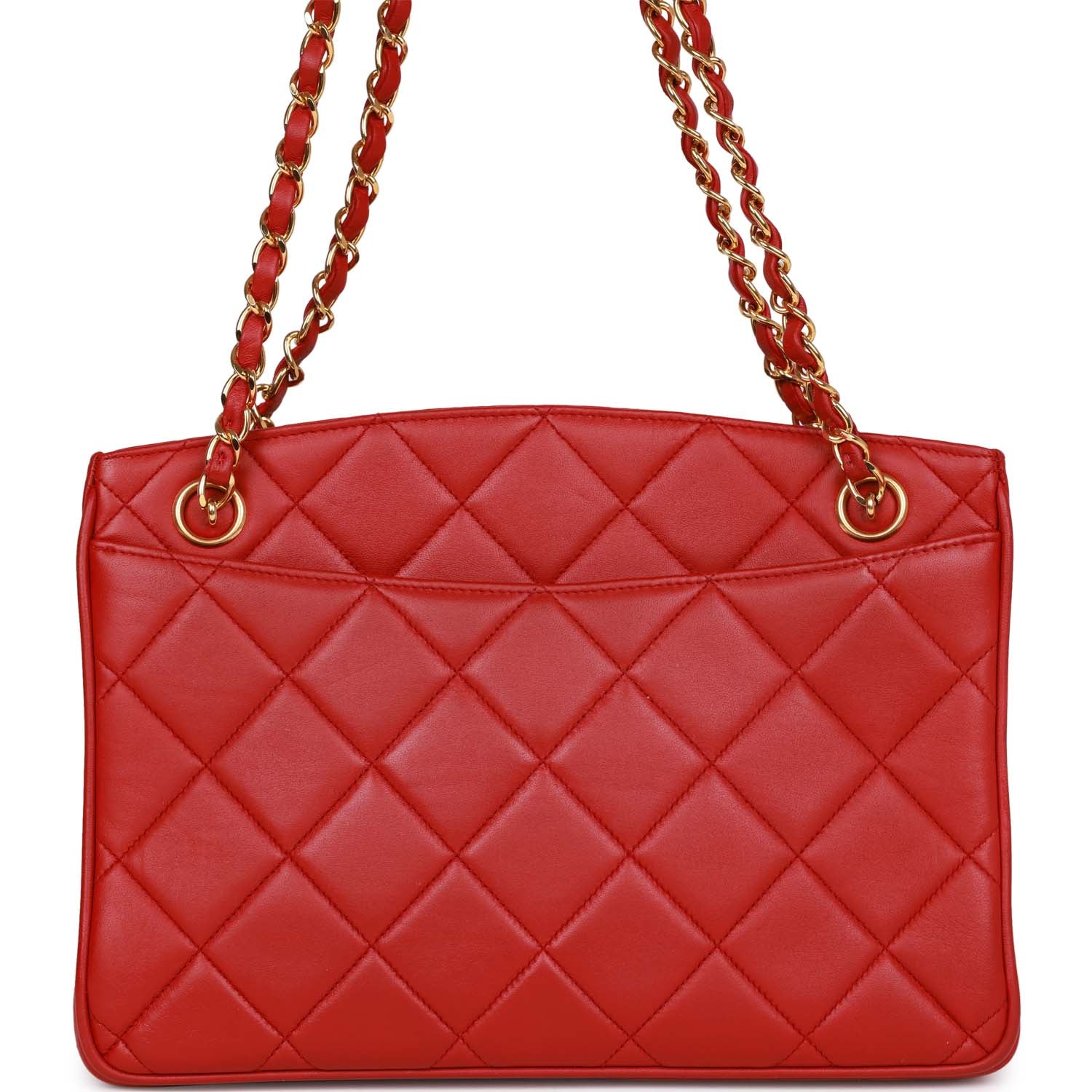 This Vintage Mini Tote bag is in red lambskin with gold hardware and features a signature CC turnlock closure, a front and back slip pocket, and two interwoven gold plated chain link and red leather shoulder straps.