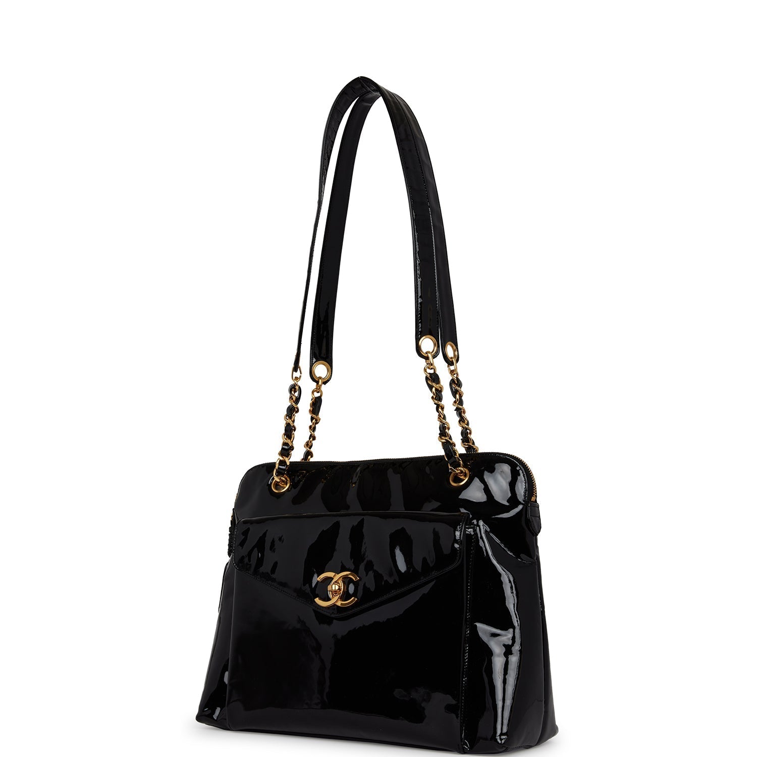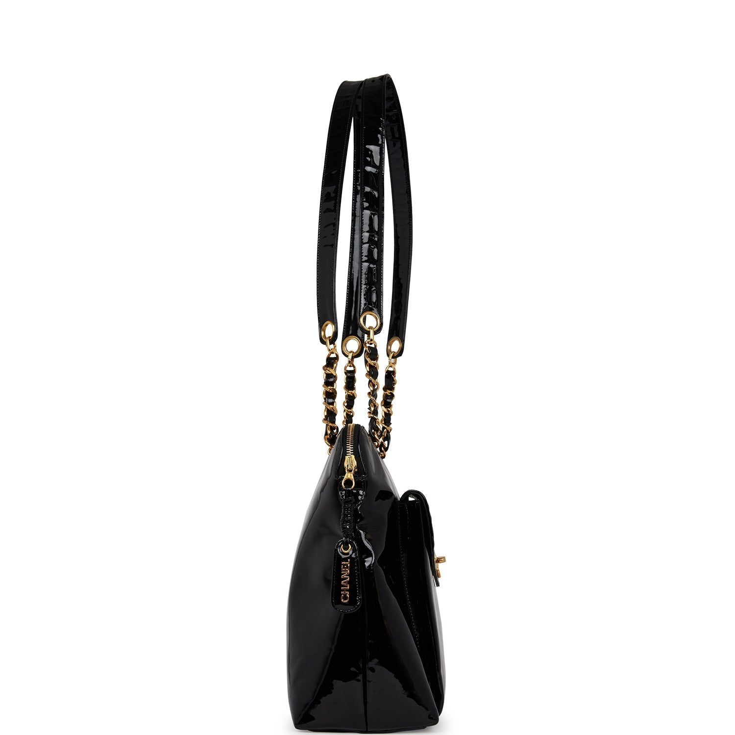 A Vintage Chanel Tote Bag in black patent with gold hardware, featuring a front flap pocket with classic gold plated CC turnlock closure, zip top closure with Chanel pull and black patent and gold chain link shoulder straps.