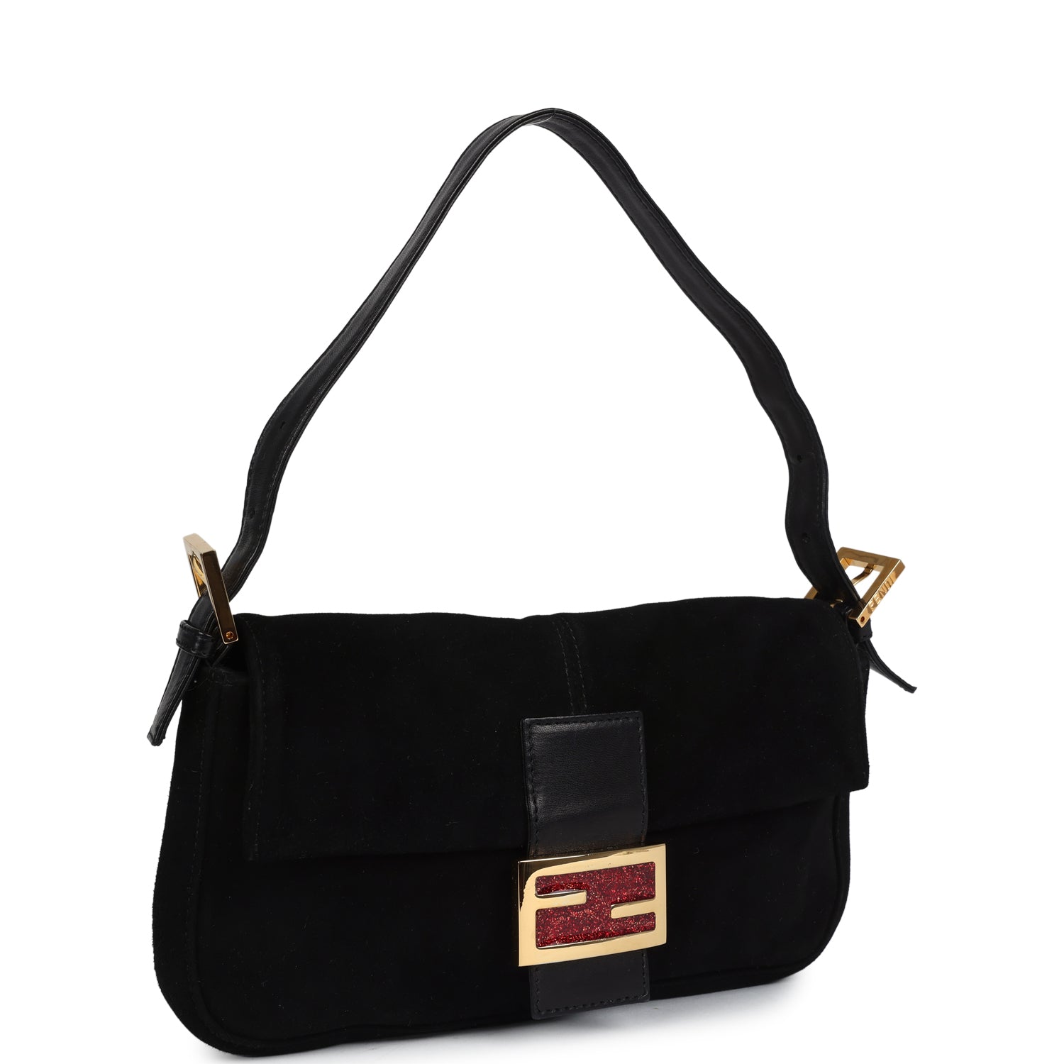 This vintage Fendi Baguette Bag is in black suede fabric with gold hardware, featuring a gold front flap snap closure with a red glitter/enamel center, and an adjustable flat leather shoulder strap.