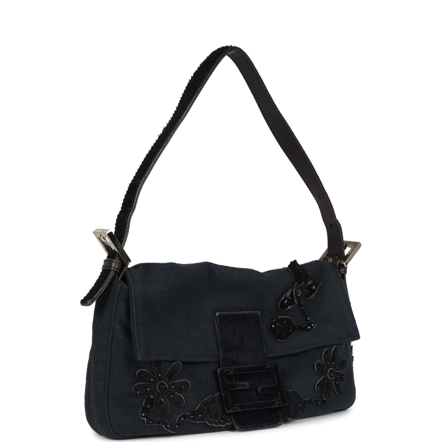 This vintage Fendi Floral Applique Baguette Bag is in dark grey wool and black pony hair with silver hardware. This handbag is crafted of dark grey felt-like wool material with floral appliques made up of black pony hair embellished with black beads. Features a front flap snap closure, and an adjustable flat leather shoulder strap.