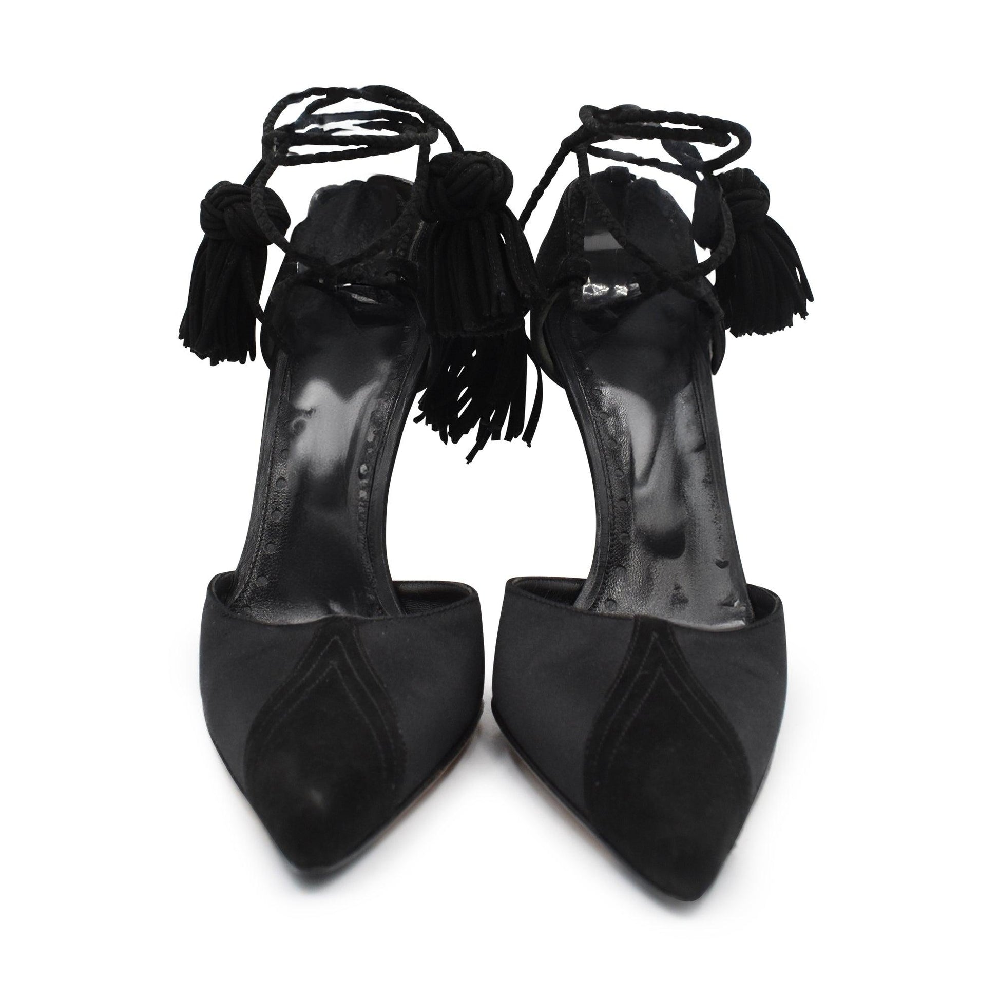 Yves Saint Laurent pointed-heels in black satin with suede panels. Features a suede stiletto heel and tassels tie up detail.