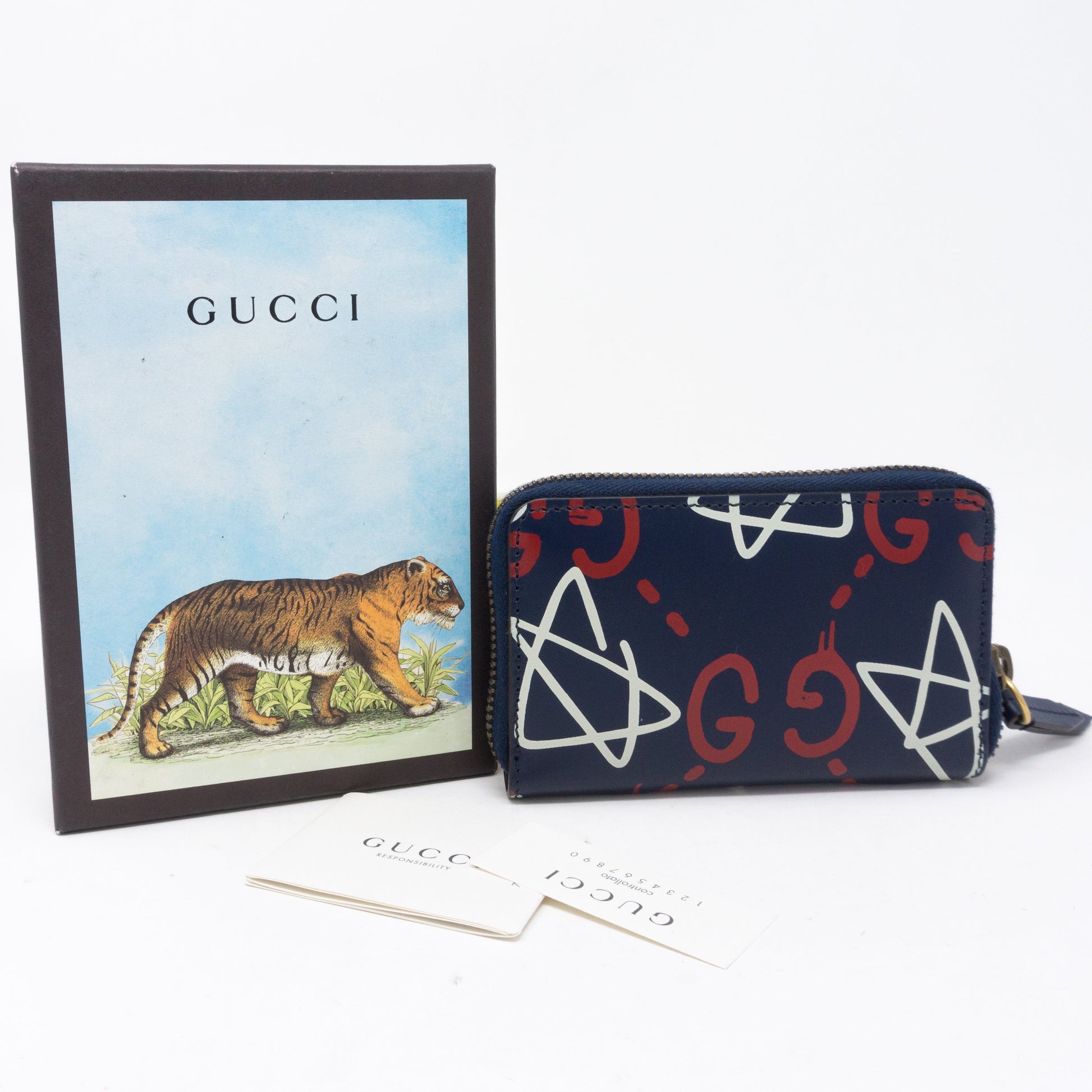 A rare Gucci zip around card case in special GucciGhost print design. Made with navy blue leather and aged gold-tone hardware. Small size is easy to take with you, it fits several cards, coins or keys. Retail price €375.
